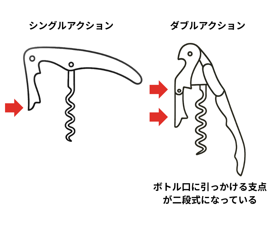 - コルクスクリュー(スパイラル)、ナイフ、テコの仕組みが一体化